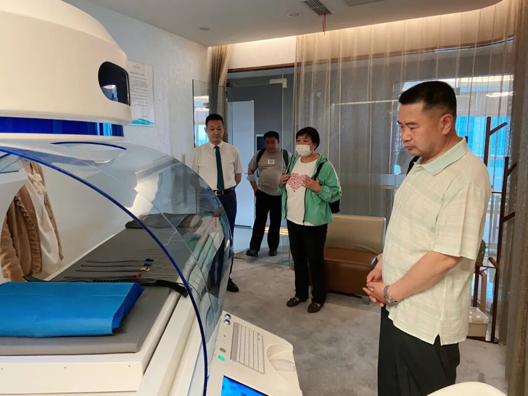 席局长一行参观了健检中心国际前沿的功能医学和自然医学深度检测设备——倍斯马身心测疗仪和TTM热断层扫描系统,以及体检专用的磁共振、CT、B超、实验室等全套临床医疗设备。